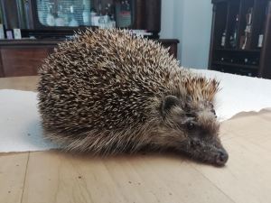 Dann gibt es noch Eddie, der Igel aus dem letzten Jahr. Wurde in einem Hausflur tagsüber gefunden. Wir haben ihn aufgenommen und es stellte sich heraus, dass er wirklich jeden Parasiten hatte, den man haben kann: Flöhe, Zecken, Darmwürmer, Lungenwürmer und zu allem Überfluss auch noch einen Hautpilz. Die Behandlung des letzteren stellte sich als sehr langwierig raus. Ich musste Eddie 6 Wochen wach halten und das bei einem Igel, der jetzt aber SOFORT Winterschlaf machen wollte. Es entstand auf seiner Seite keine besonders große Liebe. Dafür läuft jetzt nach der Winterruhe der dickste Igel Bonns auf dem Venusberg rum. Mit einem guten Kilo habe ich ihn im Frühling in die Freiheit entlassen.