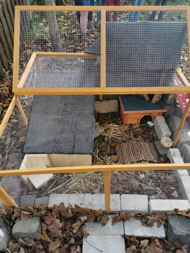 Wir kamen dann aber weiter ins Gespräch und ich fragte, ob sie nicht einen Igel überwintern wollen würden. Frau Kellerhoff war Feuer und Flamme. Die Schule kaufte ein Gehege, Stroh, Näpfe, Futter und alles weitere, was man als zukünftiger Luxusigel so brauchen könnte. Als alles da war und das Gehege aufgebaut, fuhr ich mit dem Igel Benni in die Schule.